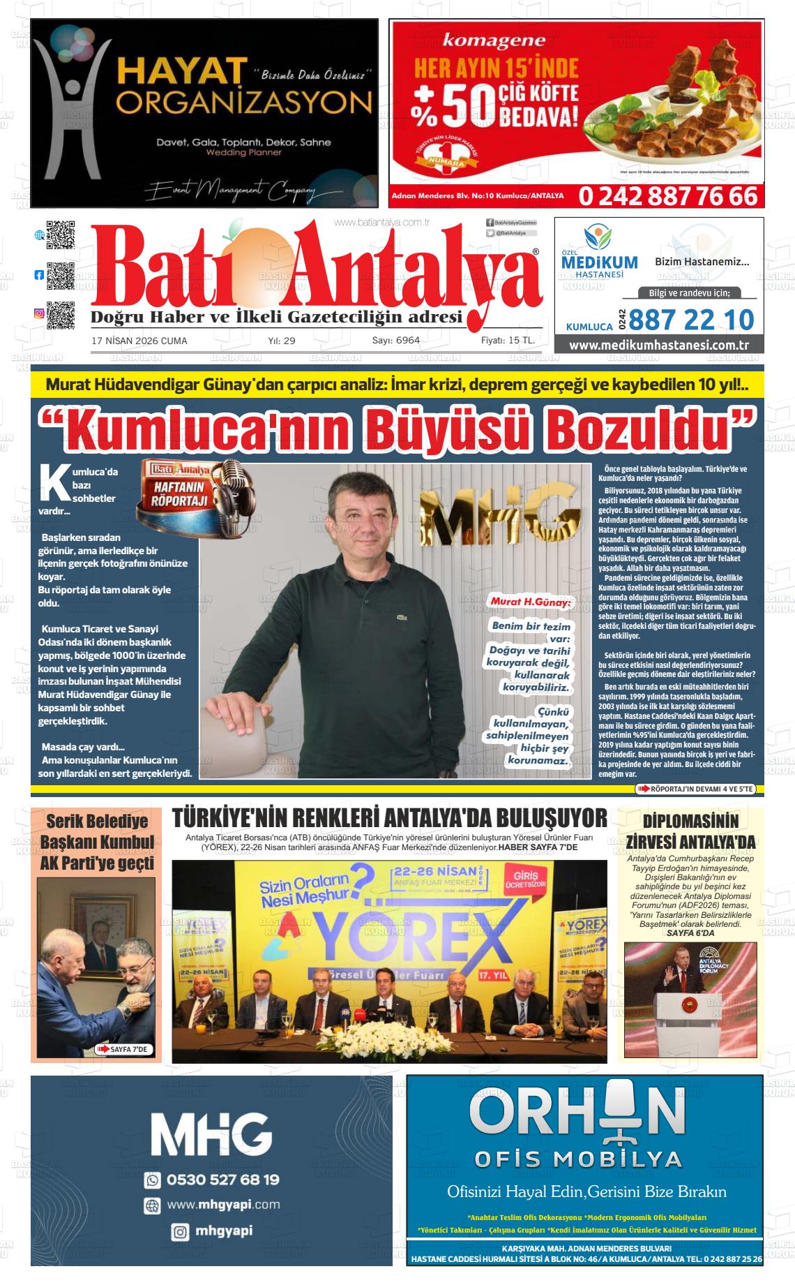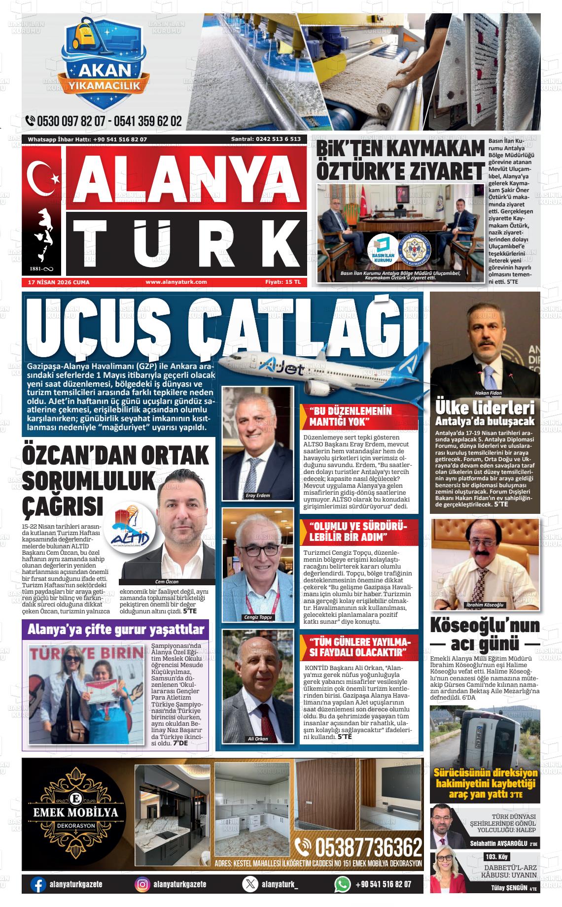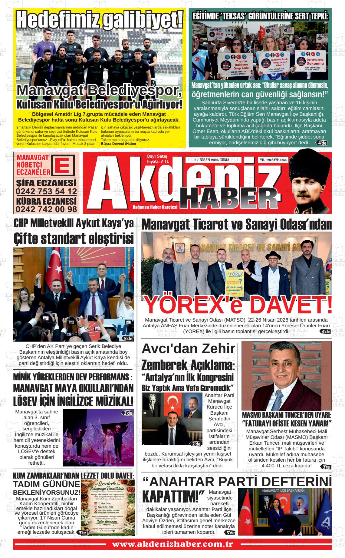 Antalya Yerel Gazeteleri 17 Nisan 2026, Cuma Günü Manşeti